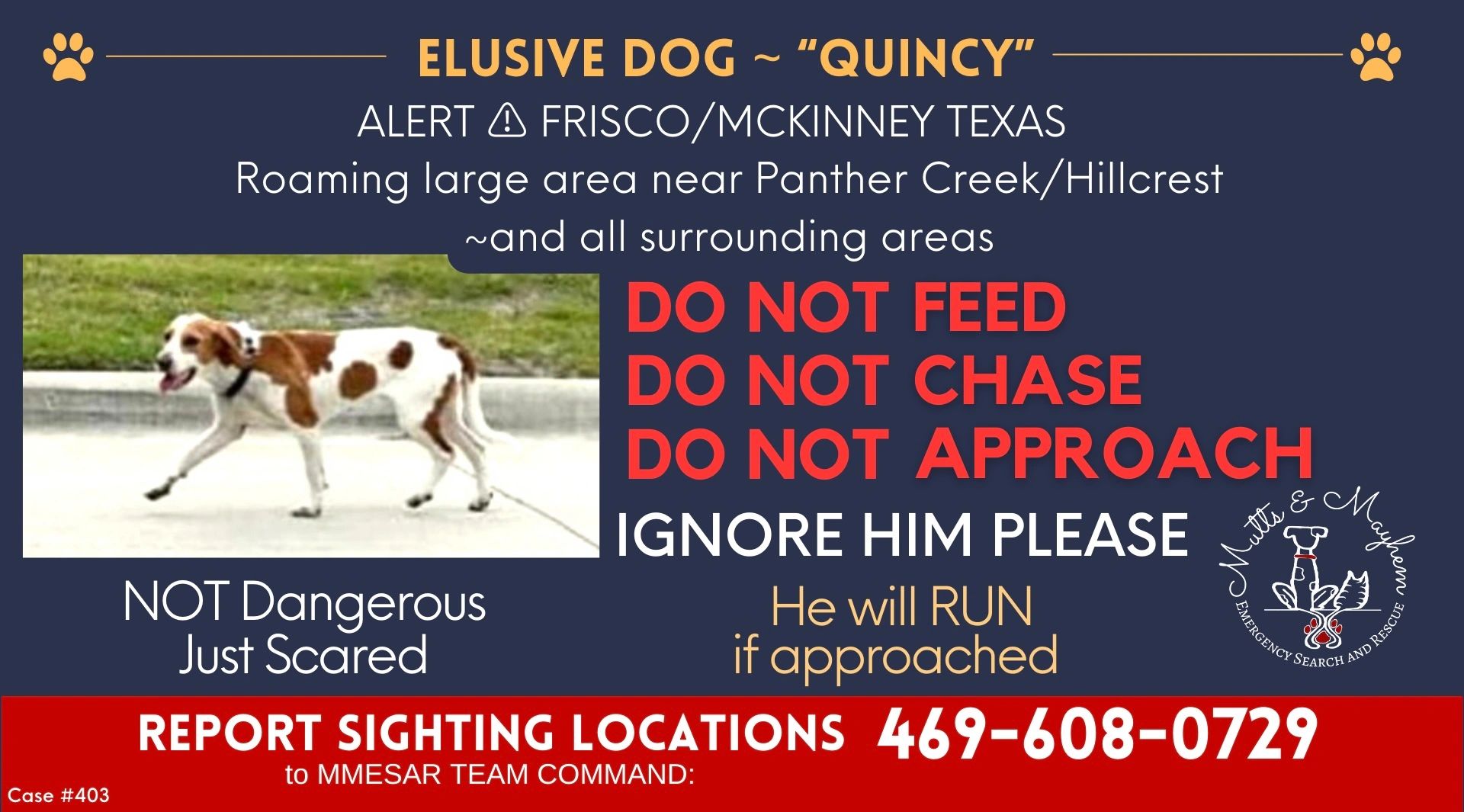 Frisco Animal Services (and Quincy’s family) has requested our assistance in capturing a lost dog named Quincy in the Panther Creek/Hillcrest area of Frisco. Quincy has been missing since 4/12/23 and the first reported sighting of him was 4/25/23.