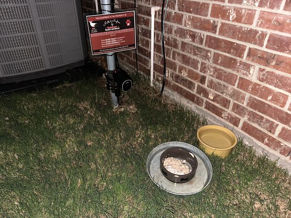 Since Soup has not shown back up into the storm drain that we need him in for capture, but he is continuing to be seen frequently topside in the vicinity of 3 neighboring houses, we decided to deploy a topside feeding station. The homeowners Bonnie and Make have generously offered to replenish the station with fresh food twice per day in hopes that he will visit to eat very soon. We provide wet cat food, rotisserie chicken, tuna, and low sodium chicken broth. We also do a chum trail to the food from his favorite hang out spots.