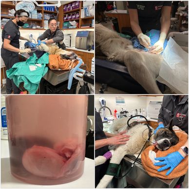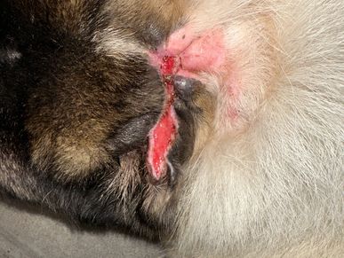 Bear remained hospitalized overnight and our team stayed with him all night. His assessment, Xrays, ultrasound, and bloodwork revealed that when Bear was struck by a vehicle shortly after he escaped 3 months ago, he suffered a spinal fracture and a skull fracture that are both healing nicely so no surgical intervention is needed. Throughout that traumatic event he suffered a traumatic brain injury, his bottom tooth punctured his upper lip, his left ear was ripped off along with a large section of tissue and muscle on the top of his head. His soft tissue and connective tissue injuries are infected with oozing puss.