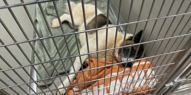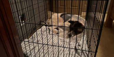 Because Bear’s kennel does not accommodate enough space for him while wearing the large post surgical cone, we brought him an extra large kennel to use during his recovery.