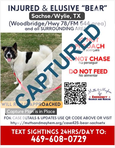 After staging on site for almost 12 hours, Bear was safely captured. Upon our initial assessment he appears to have some head trauma, most likely from when he had been hit by the vehicle weeks ago. We are transporting him immediately to Veterinary Emergency Group in Allen.