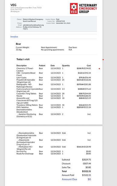 Bear received IV fluids, antibiotics, and pain medications so he is still pain free this hour. He will eventually be discharged with antibiotics and pain medication as well.
