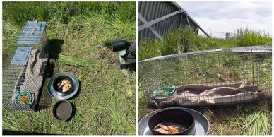 We surveyed the area for about an hour and we found the perfect isolated location to deploy our video monitored feeding station and trap. We put a little bit of food outside of the trap just in case she decides she’s too afraid to go inside right now. This would give her a chance to eat a small meal and would establish a reliable food source to where she will continue to return to this location in preparation for capture.