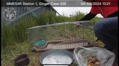 Ginger has not yet shown up to the feeding station. We do not want to capture any wildlife overnight, so we locked the trap in the closed position and put out fresh food for Ginger in hopes that she will find the station overnight.