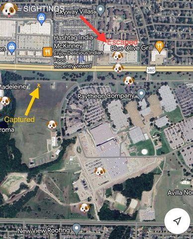 On the early morning of April 7th, after pulling an all nighter on the Farmersville capture, we decided to deploy our team on Ginger’s case before going home to sleep. We utilized recent sightings intel to try and narrow down her location and lure her to a feeding station. We were granted unlimited exterior access to the Raytheon property as Raytheon is right across the street from where Ginger escaped.